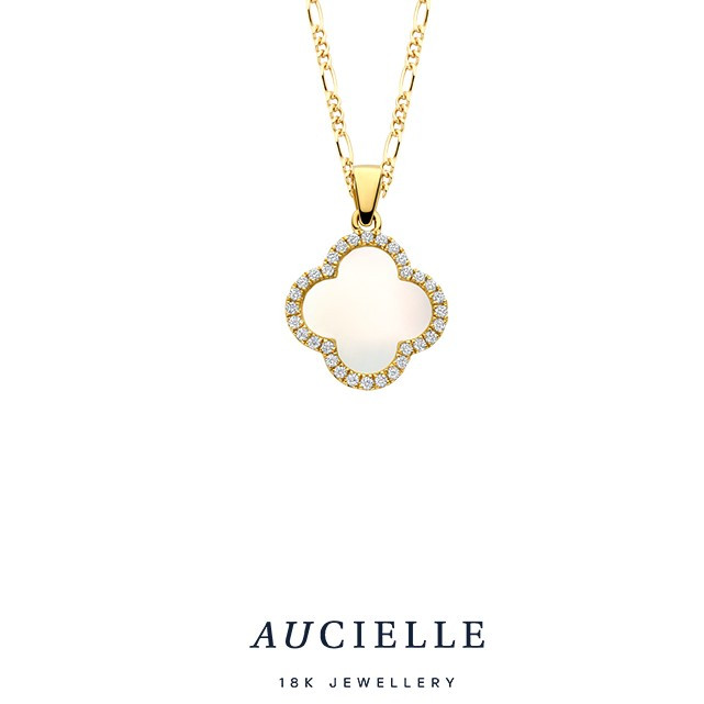 18 karaat gouden hanger gezet met zirconia en parelmoer (prijs exclusief ketting).